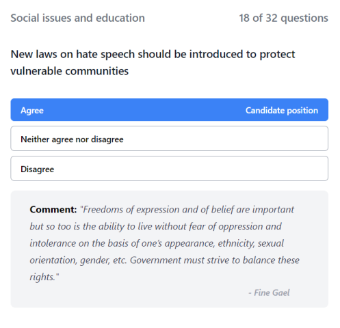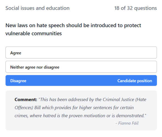 For this question, Fianna Fáil leader Micheál Martin answered “Disagree”, explaining that new hate speech laws were not needed in his party’s view.