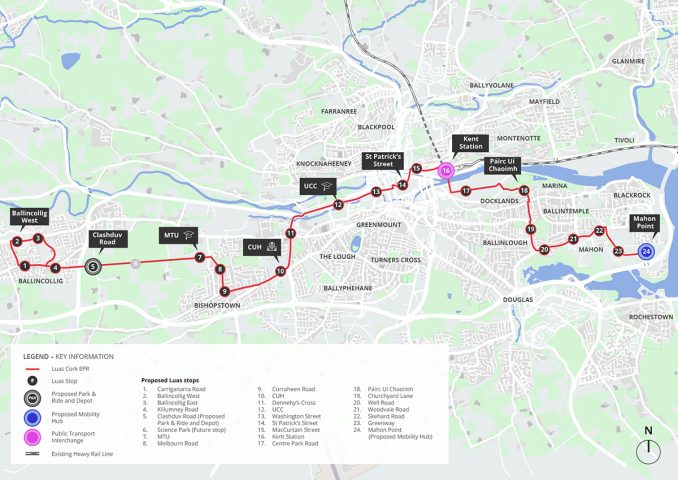 The proposed route for Luas Cork would stretch 18km between Ballincollig and Mahon Point, with up to 25 stops, servicing the city’s key destinations, such as MTU, Cork University Hospital, UCC, Cork city centre, Kent Station, Cork Docklands, Blackrock and Mahon.
