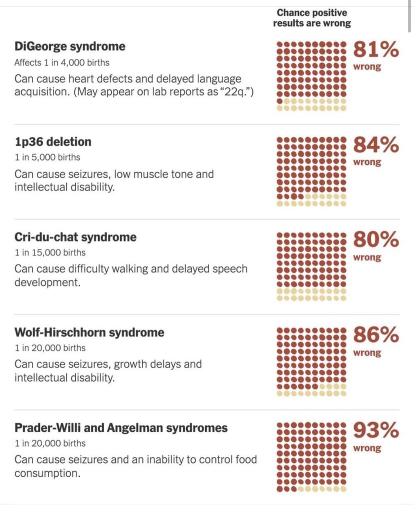 “The grave predictions made by those newer tests are usually wrong, an examination by The New York Times has found. That includes the screening that came back positive for Ms. Geller, which looks for Prader-Willi syndrome, a condition that offers little chance of living independently as an adult. Studies have found its positive results are incorrect more than 90 percent of the time”.
