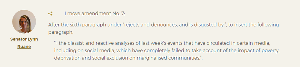 She decried the attempt to “other” the “marginalised” who had been involved, and even moved an amendment which condemned the “classist” nature of the reaction to “last week’s events”, which was seconded by Senator Eileen Flynn and accepted without a vote.