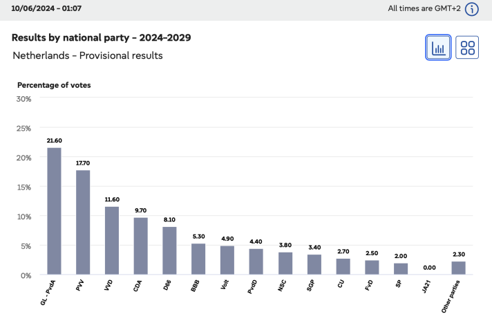 De Groenen en Liberalen zijn de grote verliezers, zij raken heel veel zetels kwijt in het Europees Parlement. Daarentegen wint de PVV fors, net als onze vrienden in Frankrijk, België, Oostenrijk, Portugal en veel andere landen. Het was een hele mooie verkiezingsdag! 💪