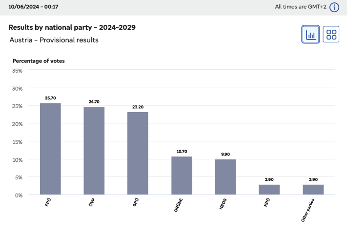 In Austria Freedom Party (Die Freiheitliche Partei Österreichs – FPÖ) took 25,70% of the votes giving it a total of 6 seats and amounting to a gain of 3 seats.