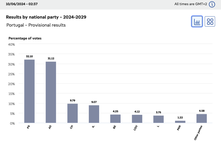 In Portugal the Chega! or Enough! Party took 9.79% of the vote giving it 2 seats.