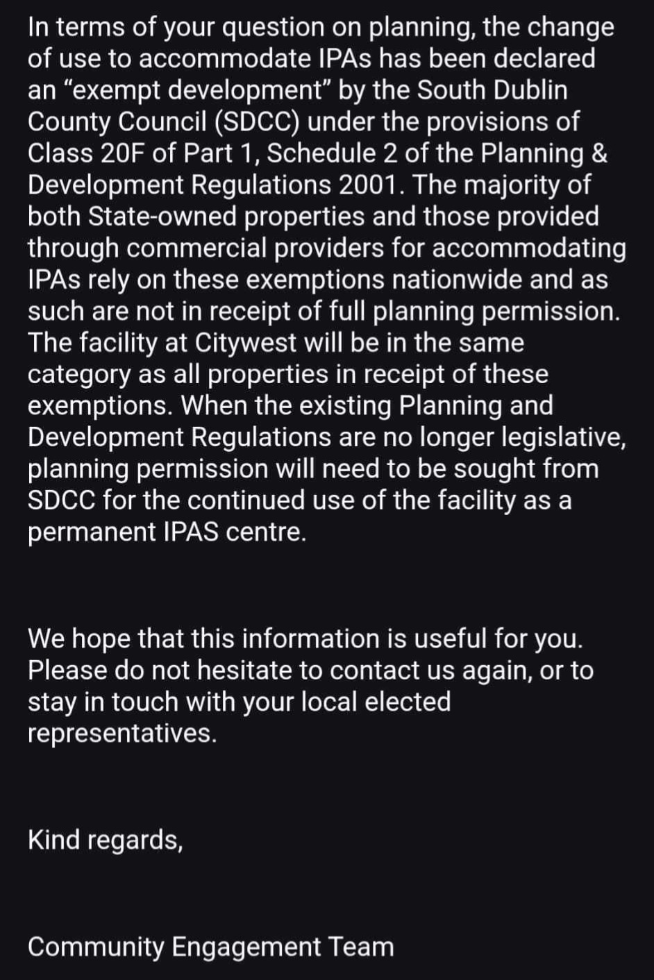 This is despite the fact that the Department of Integration had previously sent residents of Saggart, where Citywest is located, a response which stated that Citywest “has been declared an “exempt development” by the South Dublin County Council (SDCC) under the provisions of Class 20F of Part 1, Schedule 2 of the Planning and Development Regulations 2001.”