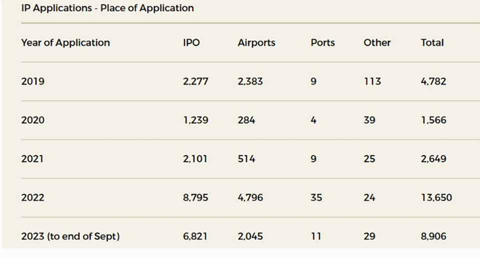 Indeed, a table which was supplied by the Minister in response to a Parliamentary Question in October 2023 showed that 77% of asylum applicants made their application at the IPO in Mount Street in the first nine months of 2023 rather than at an airport or port.