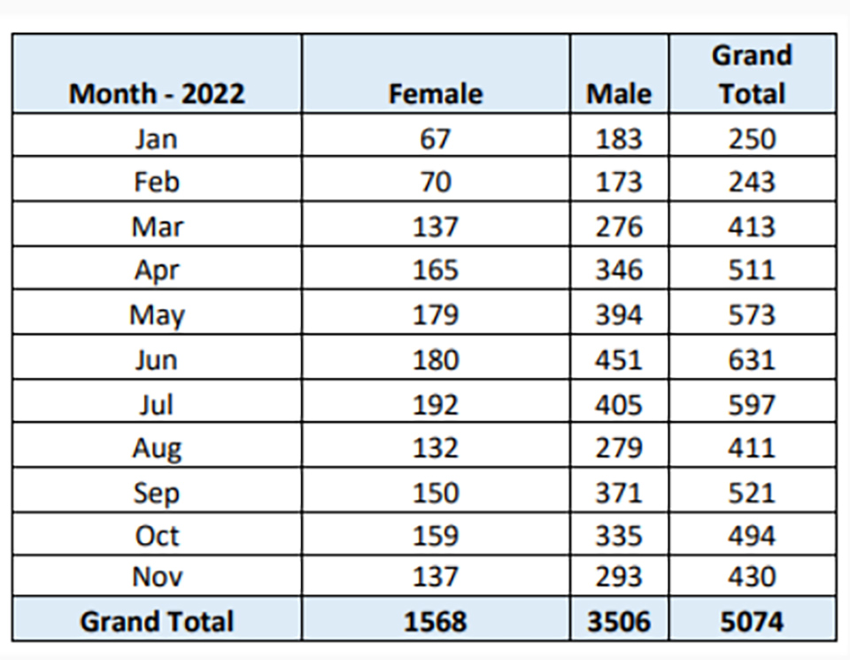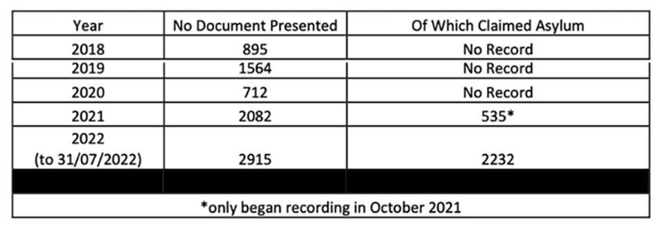 Statistics for the first seven months of 2022 show that of 2,915 people who had arrived with no documentation that 2,232, more than 76%, then applied for asylum. That represented just 29% of the 7,760 persons who applied for International Protection in the first seven months of 2022.