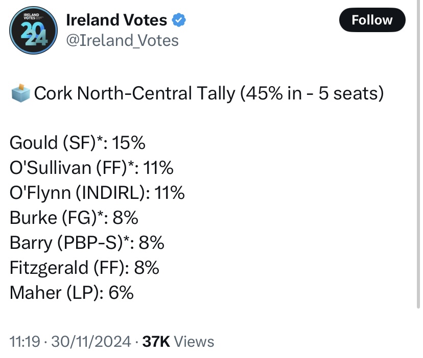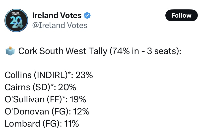 Independent Ireland leader Michael Collins has secured 23% of the vote in Cork North West, with 72% of boxes open there. Creed of Fine Gael is in second place, at 18% whole O’Shea of Fine Gael could take the third seat, with 17% of seats presently, followed by Moynihan of Fianna Fail, who is on 14%.