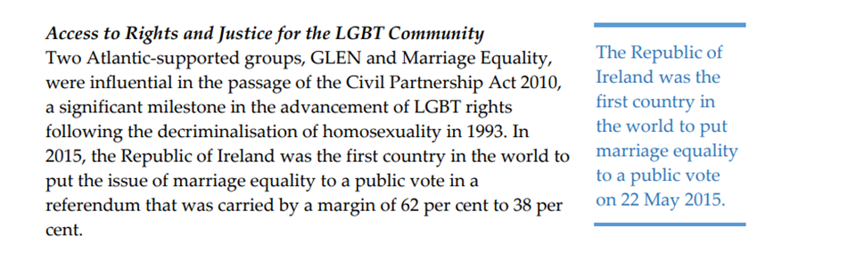 The corporate funders of those campaigns openly boasted about their pushing of the referendums. In its own account of how Atlantic Philanthropies operated in Ireland, it referred to its role in pushing for same sex marriage. The Gay and Lesbian Equality Network (GLEN) alone received $4.7 million from Atlantic which clearly regarded that campaign as the template for “others seeking progressive change.”