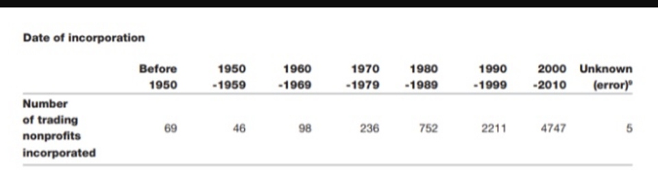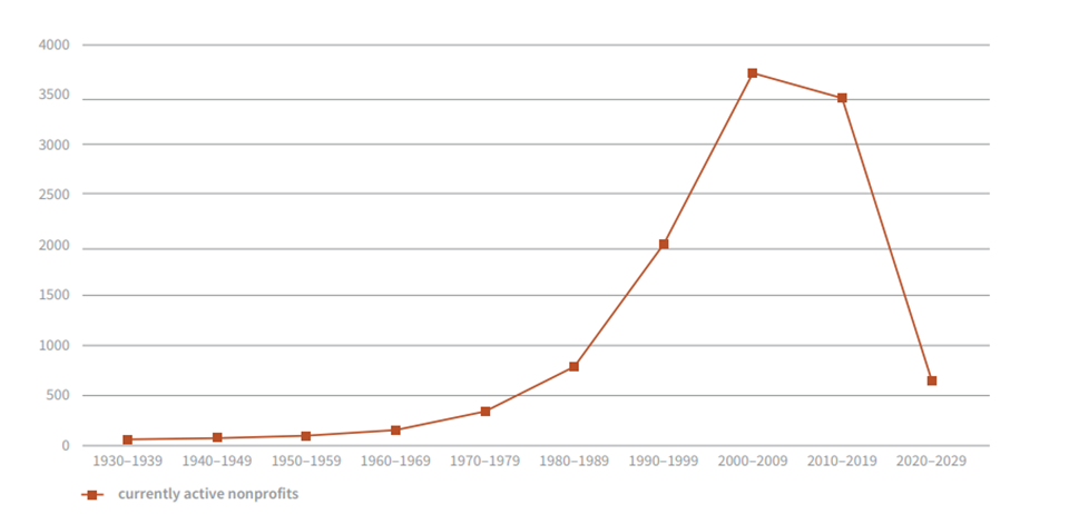A Benefacts 2021 report showed the extent and the timeline of the exponential growth in the NGO sector. There were almost three times as many NGOs incorporated in the 1990s as there had been in the 1980s, and a staggering 4,747 incorporated during the period of expansionary budgets between 2000 and 2010.