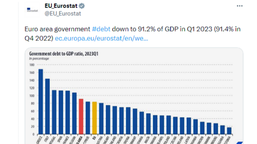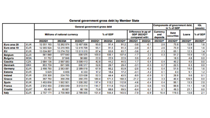 Newly published figures from the European Union appear to bring good news regarding the debt ratio of the Irish state. According to the statistics, the debt : GDP ratio stood at 43.5% for the first quarter of 2023. That is down from 52.3% in the first quarter of 2022 and compares to an EU average of 83.7%.