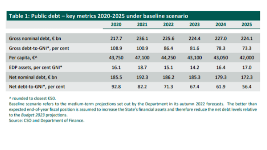 The Department of Finance publishes an Annual Report on Public Debt at the beginning of each year, and in the report published in February the proportion of debt : to GNI/GNP at the end of 2022 was given as 86%. This was equal to a per capita debt of €44,250 for each person living in the state.