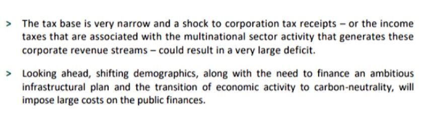 The report also refers to the challenges posed by “shifting demographics.” We all know what they are, as the proportion of persons living in Ireland, both as productive workers and as state dependents, grows steadily. Alongside that, there are the “large costs” associated with the “transition of economic activity to carbon neutrality.”