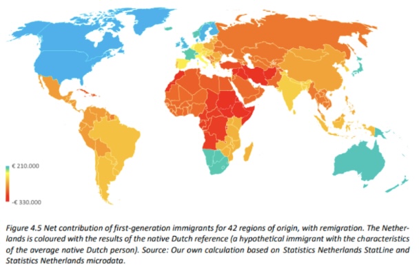 After presenting a multivariate statistical analysis about the net contributions made by various migrant groups, and the impacts of factors such as education and crime, the report comes to the stark conclusion that “open borders and a welfare state do not go together” declaring that mass immigration is on track to upend the current Dutch social democracy.