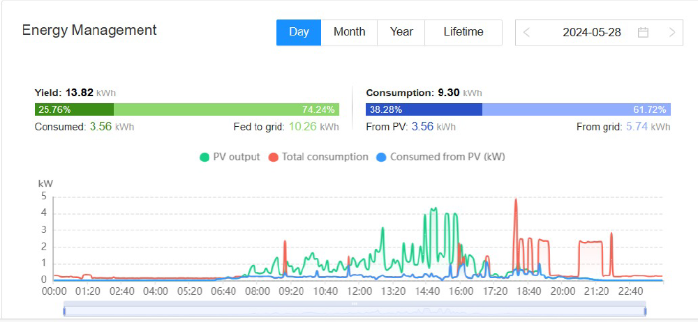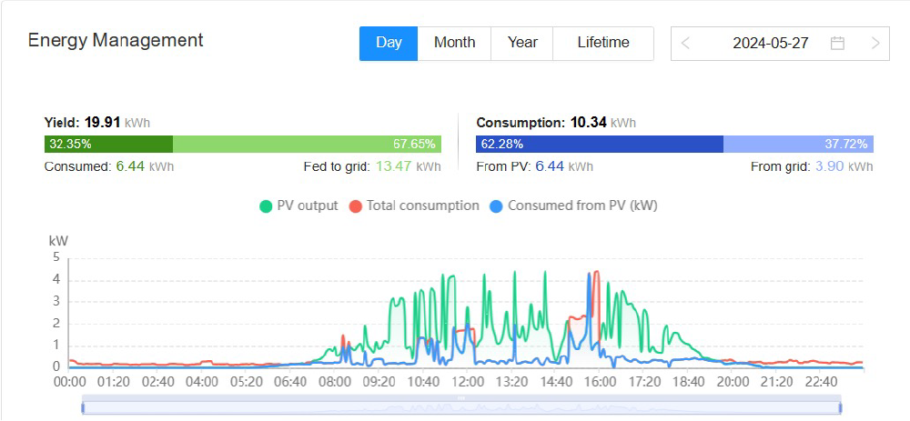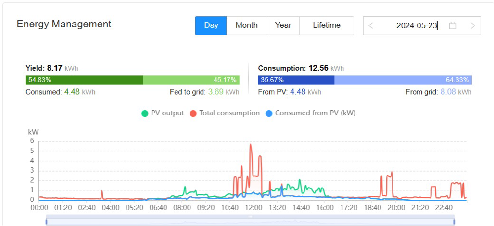 If we focus on May 23, a rainy day, we can see that the output was consistently low and peaked at 2 KW. The yield for that day was less than a third of the maximum yield that month. This is the intermittency problem we talked about.