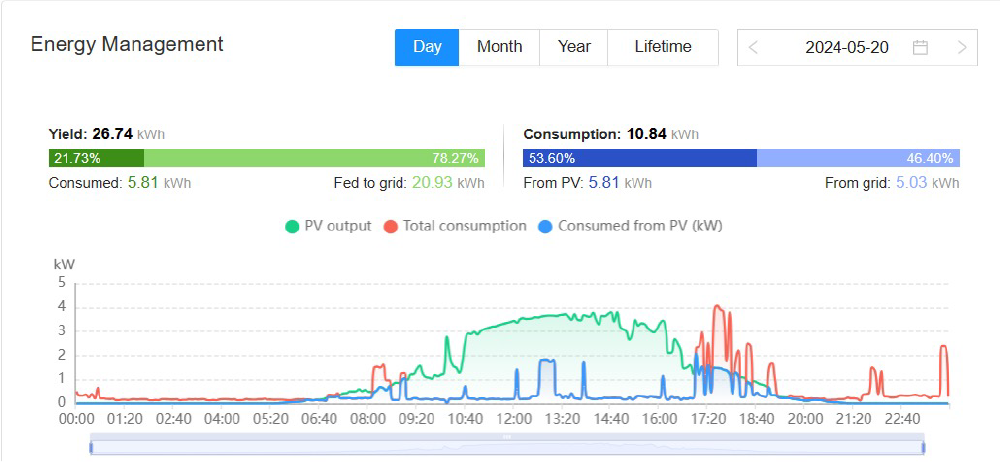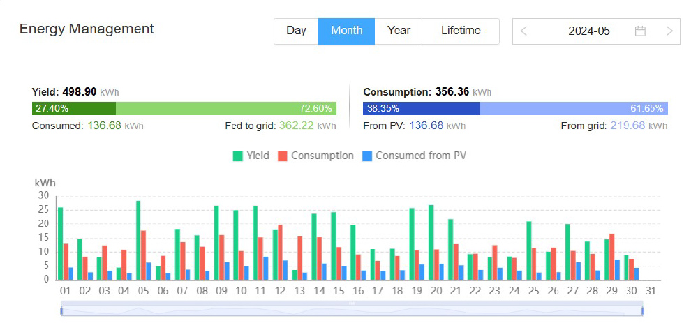 The monthly graph shows that daily yields vary between 8 KWh and 26 KWh. This is the biggest issue with weather dependent electricity and the higher the mix of renewable in a grid the more planners and managers have to deal with this unreliability with strategic methods such as backup generation and high capacity storage.