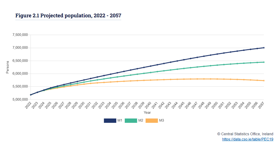 As we have seen, the CSO is now estimating that, in either a medium or high migration scenario, the population will be between 6.3 million and 6.7 million by 2050 and that the population will be up to 7 million by 2057.