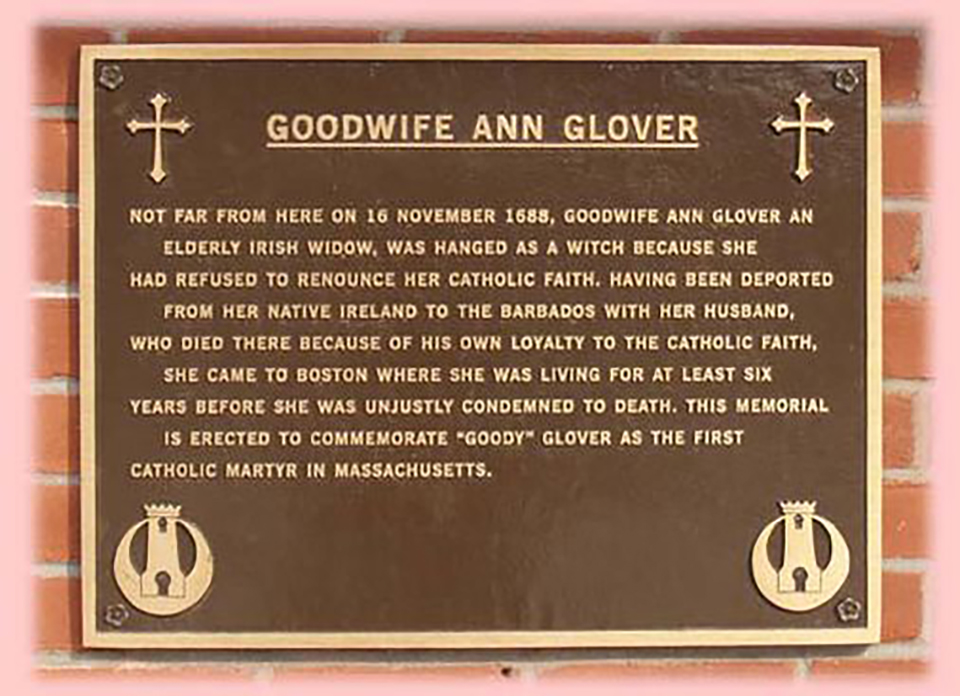 A photo of the Goodwife Ann Glover plaque in North End, Boston, Massachusetts. Photo: Jess Olsen, Wikimedia.
