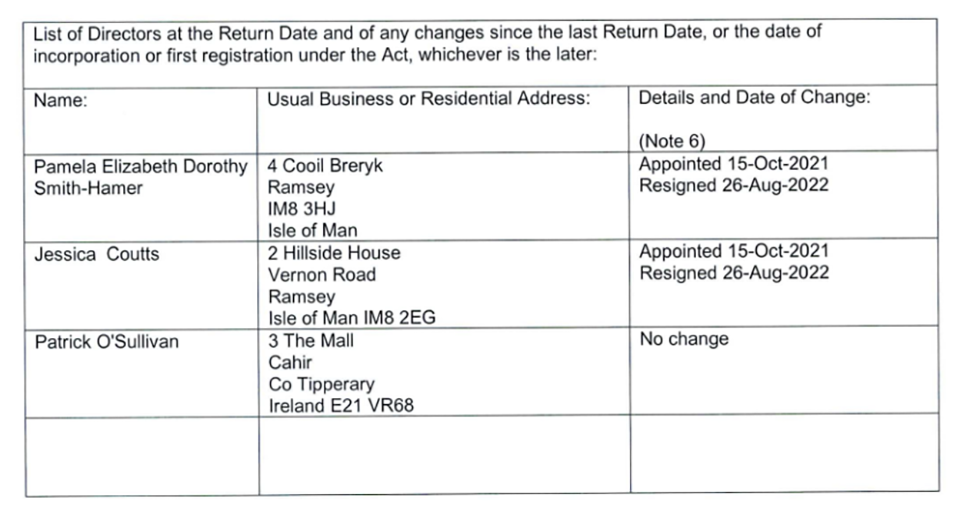 It is registered in the Isle of Man and according to its annual return registered with the Isle of Man companies office on September 9, 2024 the sole director of the company is Patrick O’Sullivan of County Tipperary.