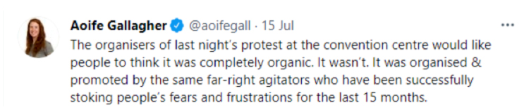 If you delve deeper into the allegedly disinterested concern of “extremist experts” like Aoife Gallagher, whose tweet above made claims of far-right agitators stoking fears, it is clear that she and her employers may be more than neutral observers.