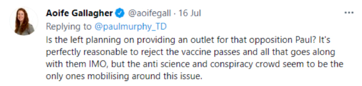 Gallagher does not even object to the protests or indeed to opposition to the vaccination certs themselves, but to the fact that the left is not setting the agenda. That is apparent from her exchanges with communist TD Paul Murphy and others.