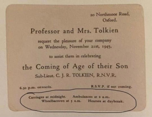 The invitation to Christopher Tolkien’s 21st birthday. Love the bottom lines… pic.twitter.com/TEKIzqrqK1