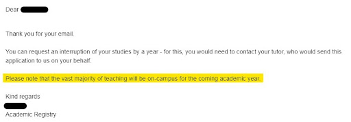 While it is possible that this arrangement may only last for the first semester, Emma also claimed that some of her lecturers have said online lectures will continue until Christmas.