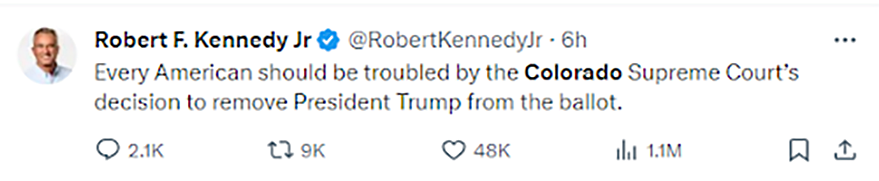 The political reaction has been pretty predictable. Among those to condemn the decision was former Mayor of New York Rudi Giuliani who has had his own legal troubles of late, but also potential wild card candidate from the disgruntled Democrat side, Robert Kennedy Junior. Rival Republican candidates Ron De Santis and Nikki Haley also criticised the decision as an abuse of judicial powers.