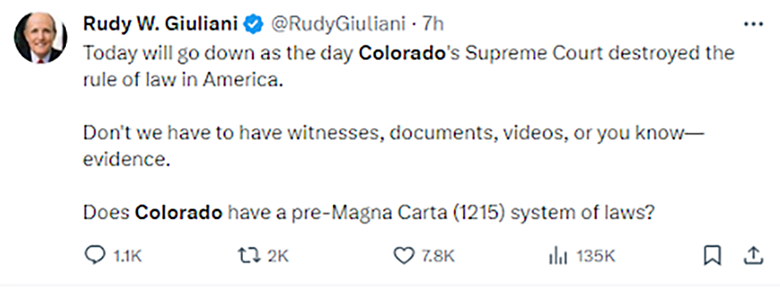 In its ruling the court states that: “A majority of the court hold that President Trump is disqualified from holding the office of president under Section 3 of the 14th amendment of the United States Constitution.”