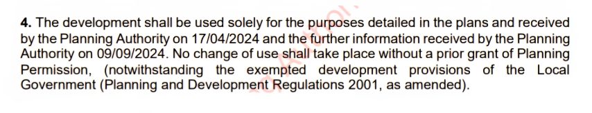 The section of the planners report from last September (below) which led to the approval of the application for a guesthouse/hostel is worth reading. It clearly states that approval was being granted solely for the purpose outlined and there are a substantial number of documents related to environmental and other conditions pertaining to the original application.