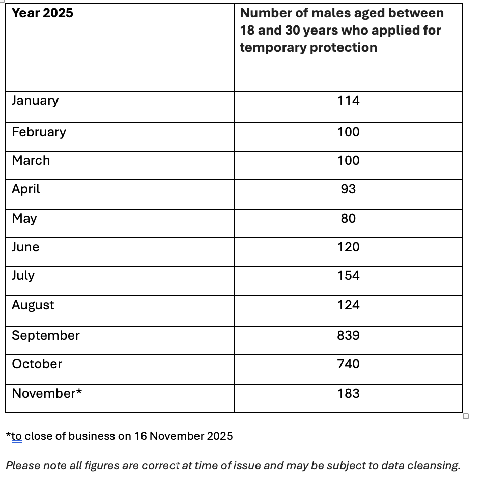 The figures were released to Independent TD, Carol Nolan, who asked the Minister to state the number of Ukrainian men between the ages of 18 and 30 who have applied for temporary protection in Ireland in each month from January 2025 to date.