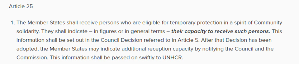 The relevant EU Directive, as Gript has several times referred to, is 2001/55/EC which sets out the criteria for “giving temporary protection in the event of a mass influx of displaced persons and on measures promoting a balance of efforts between Member States in receiving such persons and bearing the consequences thereof.”