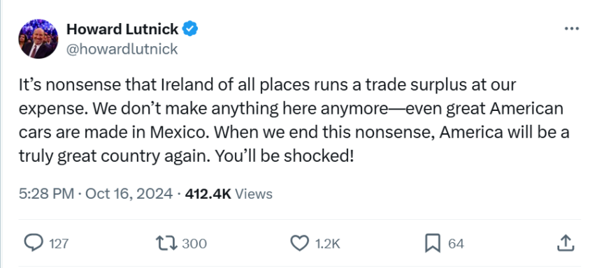 US President-elect Donald Trump’s Commerce Secretary pick, Howard Lutnick voiced strong disapproval recently about the way in which Ireland achieves a trade surplus with the US, describing the situation as “nonsense”.