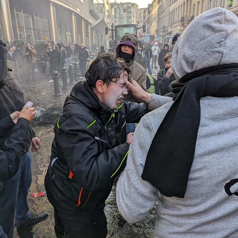 By 4 p.m., the crowd in front of the barricade had built up again, with young men darting in and out of range of the firehoses, taunting the cops. More bottles were sent over along with a clattering of cans. One stood, two fingers raised at the EU, quivering in a crossfire of water as he gulped and bellowed defiance. The mood caught, objects were hurled, and a mattress set ablaze. A man in a mask—the only one I saw—began prying up cobblestones. He got angry glares and rebukes from the surrounding farmers and a tongue-lashing from one woman; he left them. One, however, ended up in the hands of a kid with braces who couldn’t have been more than fourteen; dashing too close to the barricade to fling it, he caught a full face of pepper spray and went down howling, clutching at his eyes.