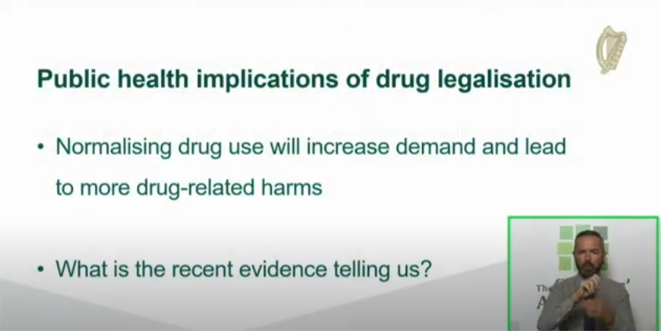 Smyth referred to the high level of cannabis use, with 8% of the population being regular users and 20% of those having developed a misuse disorder. There are over 50,000 drug related hospital cases each year and drug use was implicated in 409 deaths in 2020, she said.