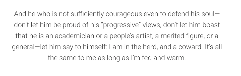 More to the point, and evidence that he has indeed reflected over the past months and reflected well, he refers to the example of Alexander Solzhenitsyn. Solzhenitsyn, of course, lived a life of great courage in the face of the beast of the Portland reds having slouched into Bethlehem.