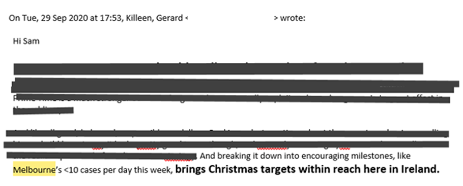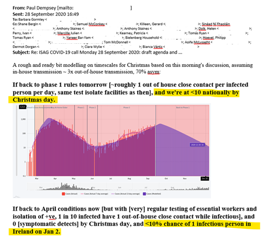 Here’s their mathematical modeller, Paul Dempsey, back in September, full of optimism, showing that with how things were going at the time we’d be at below 10 daily cases by Christmas. A later email says that with April style lockdown we would have been at zero. That, it turns out, was desperately wrong. But it hasn’t impacted their certainty.