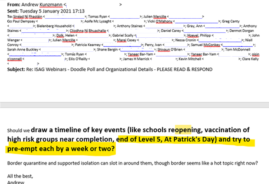 Later, Andrew Kunzmann of Queens University tells the group that Paddy’s day is a “decent target” but that they should also show they are ahead of the science by ‘pre-empting’ the dates: