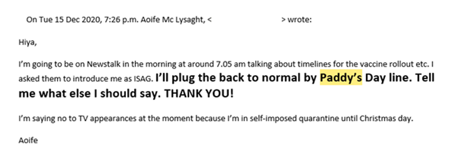 There are a couple of interesting things there: First, the admission that Ireland is already in “full lockdown”. Second, there’s the revelation that she doesn’t think anyone will believe the “paddy’s day” message. Third, there’s the big concern, and this is really telling: For all that “Zero Covid” is supposed to be about the fastest way to open the country up, her real concern is how to keep it locked down even longer, after people are vaccinated. How does that remotely square with what Ryan is saying in the Sunday Independent? On the one hand, they want to “open up by April” – and on the other hand, their own scientists are warning that we need to stay locked down even after the vulnerable are vaccinated, which would mean lockdown well into the Summer. So in the Sunday Independent, are we reading Science, or are we reading Spin?